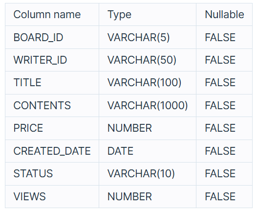 다음은 중고거래 게시판 정보를 담은 USED_GOODS_BOARD 테이블과 중고거래 게시판 첨부파일 정보를 담은 USED_GOODS_REPLY 테이블입니다. USED_GOODS_BOARD 테이블은 다음과 같으며 BOARD_ID, WRITER_ID, TITLE, CONTENTS, PRICE, CREATED_DATE, STATUS, VIEWS은 게시글 ID, 작성자 ID, 게시글 제목, 게시글 내용, 가격, 작성일, 거래상태, 조회수를 의미합니다.