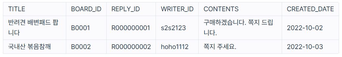 USED_GOODS_REPLY 테이블은 다음과 같으며 REPLY_ID, BOARD_ID, WRITER_ID, CONTENTS, CREATED_DATE는 각각 댓글 ID, 게시글 ID, 작성자 ID, 댓글 내용, 작성일을 의미합니다.