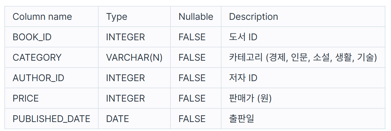 BOOK 테이블은 각 도서의 정보를 담은 테이블로 아래와 같은 구조로 되어있습니다.