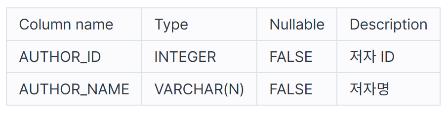 AUTHOR 테이블은 도서의 저자의 정보를 담은 테이블로 아래와 같은 구조로 되어있습니다.