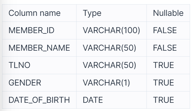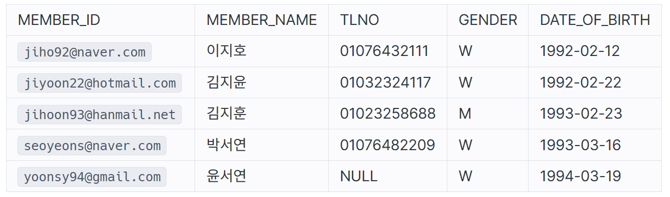 다음은 식당 리뷰 사이트의 회원 정보를 담은 MEMBER_PROFILE 테이블입니다. MEMBER_PROFILE 테이블은 다음과 같으며 MEMBER_ID, MEMBER_NAME, TLNO, GENDER, DATE_OF_BIRTH는 회원 ID, 회원 이름, 회원 연락처, 성별, 생년월일을 의미합니다.