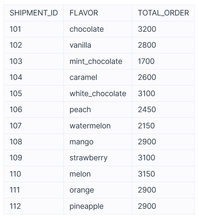 FIRST_HALF 테이블은 아이스크림 가게의 상반기 주문 정보를 담은 테이블입니다.FIRST_HALF 테이블 구조는 다음과 같으며, SHIPMENT_ID, FLAVOR, TOTAL_ORDER는 각각 아이스크림 공장에서 아이스크림 가게까지의 출하 번호, 아이스크림 맛, 상반기 아이스크림 총주문량을 나타냅니다.